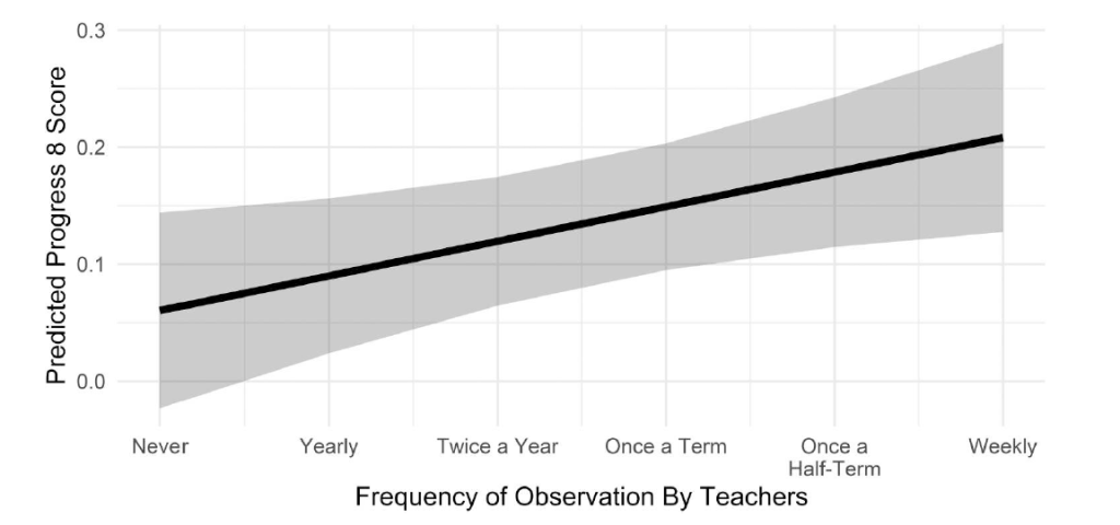 Predicted marginal effects of frequency of classroom observations by teachers on progress in students attainment (i.e Progress 8)